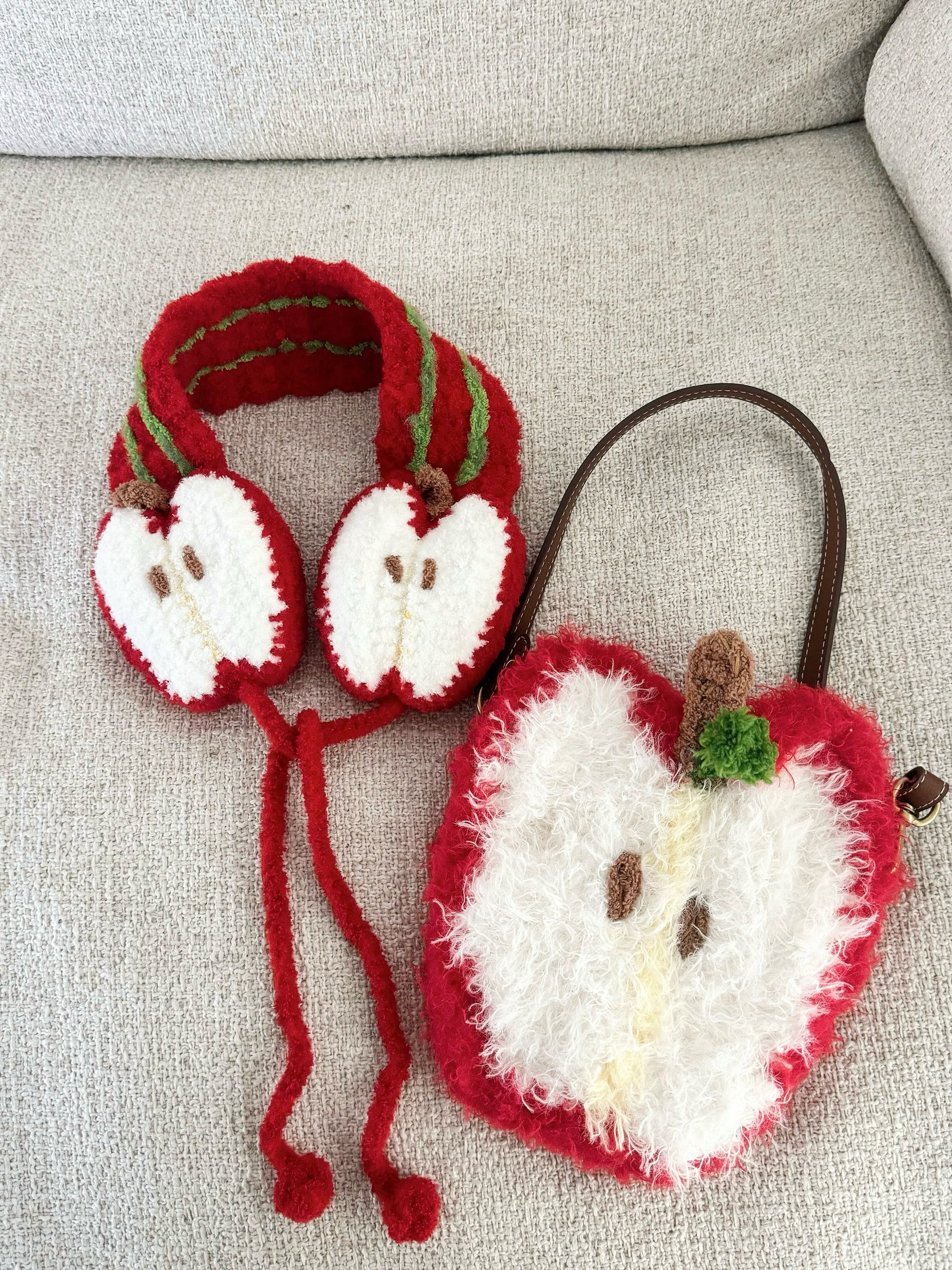Crochet apple earmuffs and bags